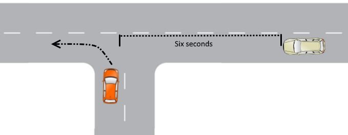 The left turn is less complex but we need to give way to pedestrians. Once we complete the turn,we should move at the same speed of traffic behind or they have to brake or change lanes. So,we need at least 6 seconds of time for completing the turn and acceleration.